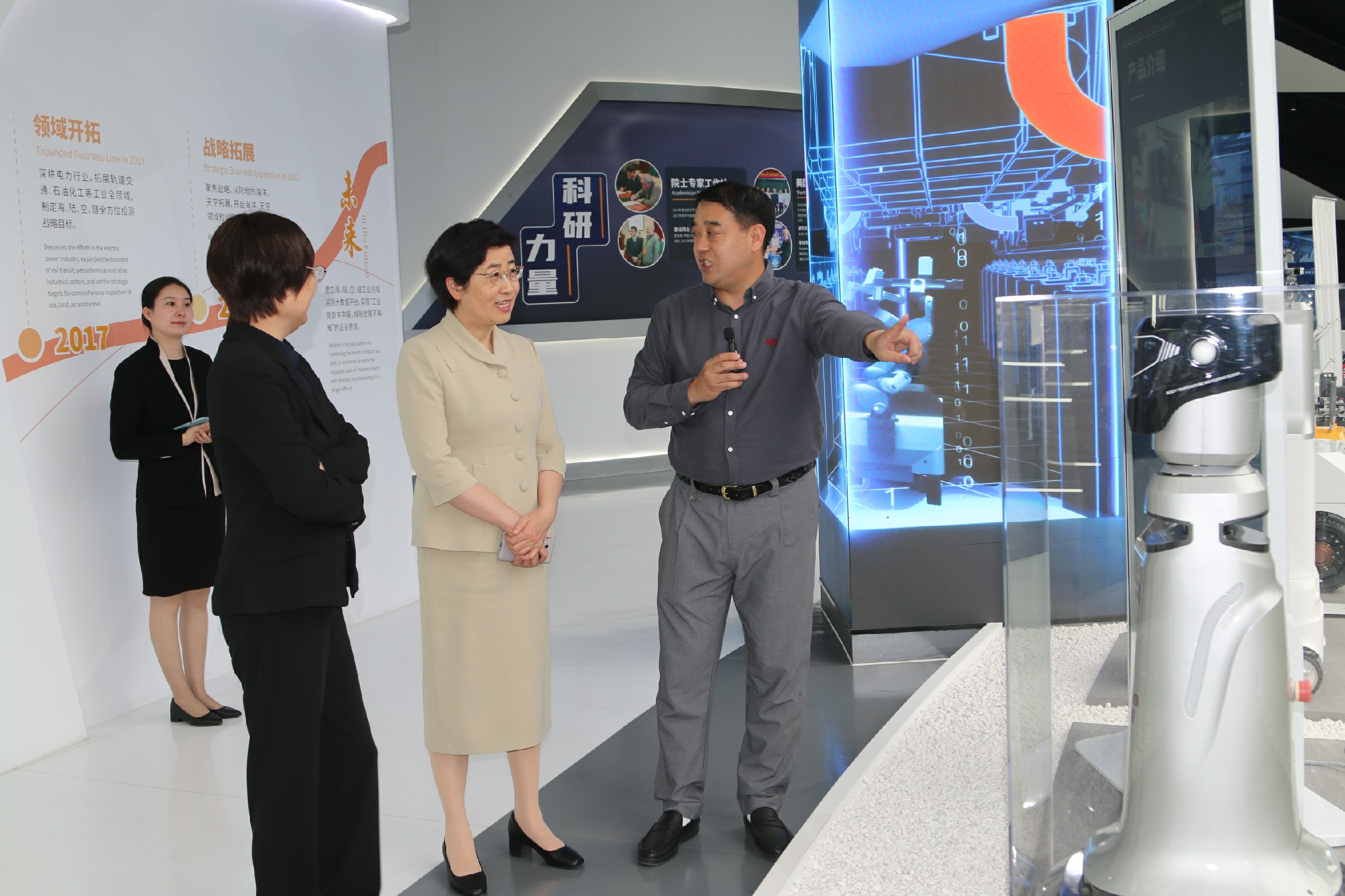 陳常務副市長一行參觀了電力館、軌道交通、石油石化館、未來館、數據中心,考察了申昊科技的前沿技術、創新成果及人工智能產品應用情況。