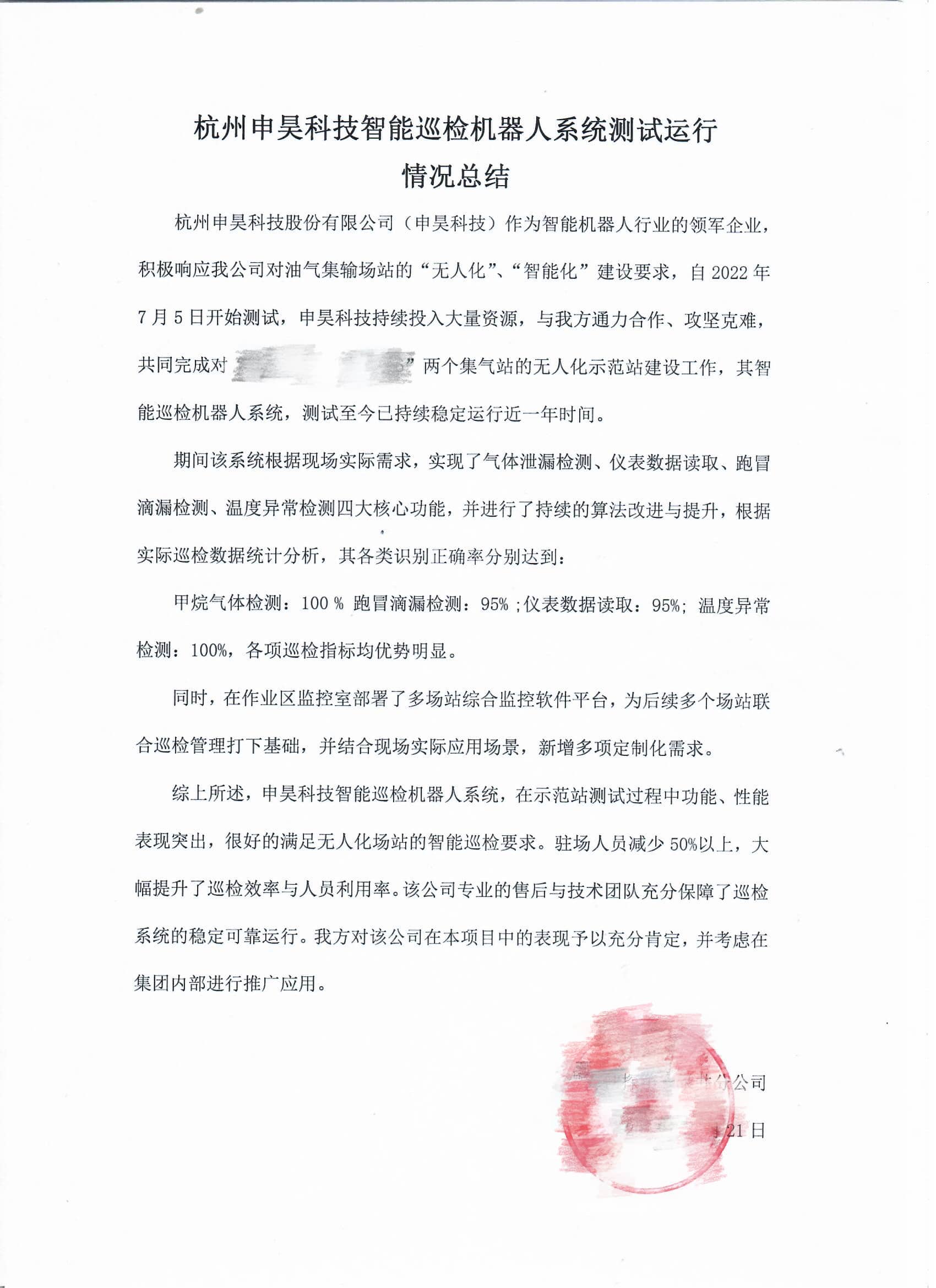 運行一年多時間里,申昊科技根據現場的實際需求,對氣體泄漏檢測、儀表數據讀取、跑冒滴漏檢測、溫度異常檢測四大核心功能,進行了持續的算法改進與功能升級,并通過了功能、性能測試與長期穩定性測試。根據實際巡檢數據統計分析顯示,甲烷氣體檢測和溫度異常檢測正確率達到了100%、跑冒滴漏檢測和儀表數據讀取準確率達到了95%。為預防和及時處理問題提供了有力支持。